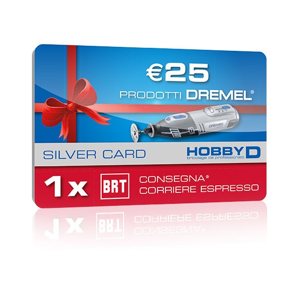 La Silver Card permette di acquistare € 25,00 (iva compresa) di prodotti Dremel nel sito HobbyD ed avere la prima consegna inclusa*. La card verrà inviata all'indirizzo di spedizione indicato in fase di acquisto tramite posta prioritaria e sarà attiva dopo 5 giorni. Nel caso in cui non si riceva la card entro tale data, con una semplice segnalazione via email a card@hobbyd.com, la stessa sarà bloccata e ne sarà riemessa una nuova. Nel caso in cui si desideri attivare anticipatamente la card sarà sufficiente richiederlo via email a card@hobbyd.com.